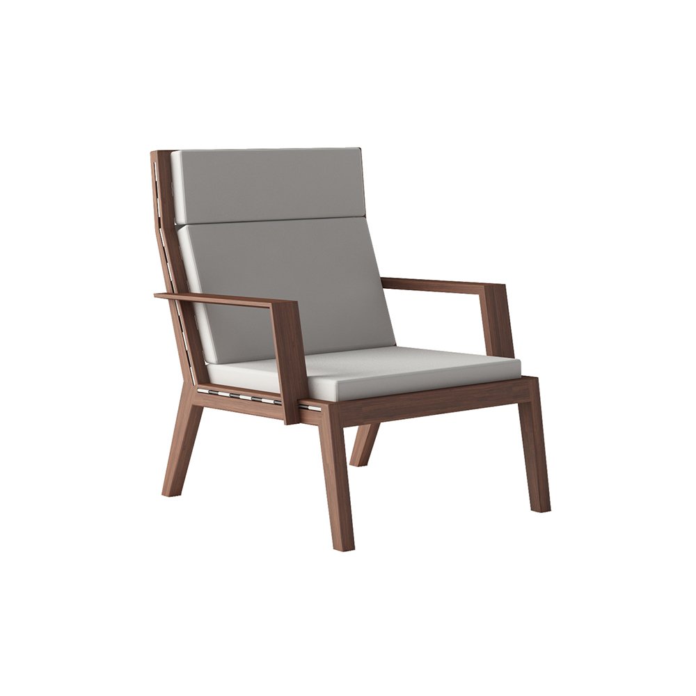 TROPICAL WOOD FRAME / ALUMINUM DETAILS / WOVEN FABRIC BELT SEAT AND BACK / SEAT – BACK CUSHION INCLUDED