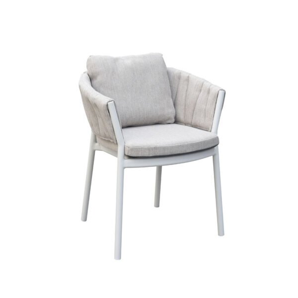 POWDER COATED ALUMINUM FRAME / UPHOLSTERED BACK AND ARMRESTS / SEAT AND BACK CUSHIONS INCLUDED