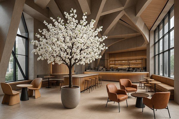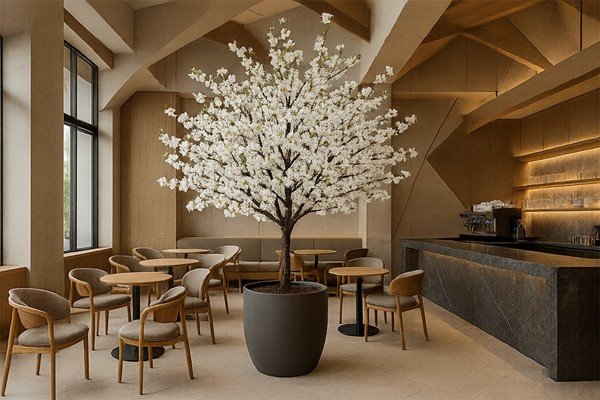 Η τεχνητή ροδακινιά είναι ένα πολύ όμορφο δέντρο εσωτερικού χώρου. Έχει λείο και ψηλό κορμό, όρθια μεγάλα κλαδιά και λογχοειδή φύλλα, ενώ τα άνθη της είναι μεγάλα και λευκά. Διαθέτει μεταλλική βάση και μπορεί να βιδωθεί στο πάτωμα ώστε να είναι πιο σταθερό. Θεωρείται ιδανική επιλογή διακόσμησης για επαγγελματικούς χώρους όπως καφέ, μπαρ, ξενοδοχεία, αλλά και για χρήση σε εποχιακές διακοσμήσεις όπως γάμοι, βαφτίσεις κλπ.